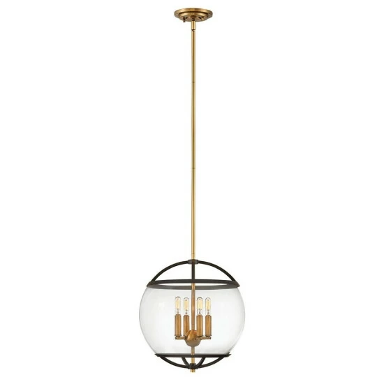 The wide glass band featured in Calvin clearly has global appeal, but the sphere of influence does not stop there. The orb is completed by the rounded, open cage on top and bottom to add style and stability. This mid-century modern silhouette in Polished Nickel, Heritage Brass or Black with Heritage Brass finish encloses a classic candle cluster.
