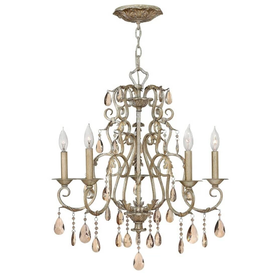 Carlton’s elegant petite candelabra iron design, finished in authentic Silver Leaf, makes a sophisticated statement with luxurious amber pearl crystals, optional translucent organza shade and ornate details.
