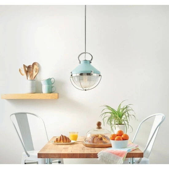Smooth sailing ahead with the striking Crew pendants. Chicly designed with a hint of coastal panache, the pressed holophane glass globes are covered in a wire cage inspired by vintage maritime lighting. Offered in crisp Polished Nickel, Black with Heritage Brass, or Robin’s Egg Blue finishes, the single or linear pendants enhance modern, rustic, industrial or coastal spaces alike.
