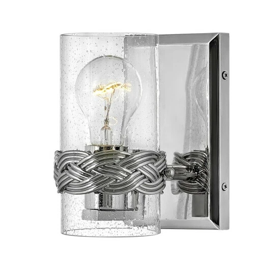 A new nautical classic, Nevis draws inspiration from seafaring style. The intricately crafted interwoven cast bracelet details the strands of a sailor’s knot and envelops vertical clear seedy glass sleeves. A gleaming Polished Nickel backplate adds to the jewel-like effect. Ideal for filament bulbs.
