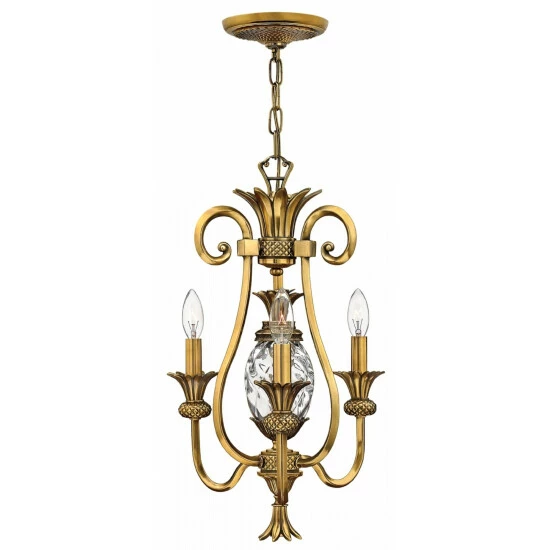 A Hinkley classic the ornate Plantation collection features exceptional pineapple shaped clear optic glass that makes a noble statement. The Burnished Brass Pearl Bronze and Polished Antique Nickel finishes have matching candle sleeves and elaborate decorative cast detailing.