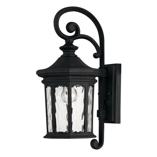 Raley’s regal appearance features a bold Museum Black or Oil Rubbed Bronze finish, flourishing details and clear water glass panels for a dignified style statement.